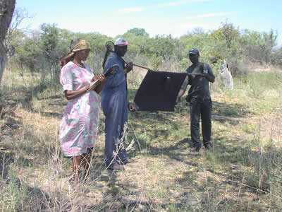 A human fly round consists of a team of 2-3 people with hand nets who walk through the bush. The team follow a prescribed route and stop at regular, usually marked, stations to collect the flies that are following them.