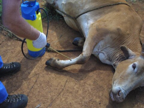 The traditional method of treating cattle with insecticide to control tsetse usually follows the standard practices used for controlling ticks: the whole body is treated by either dipping or spraying the animal to run-off with a dip wash, or a pour on formulation is applied along the animal’s back line.