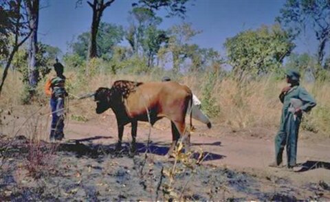 An ox fly round is similar to the traditional human fly round, except that the team comprises 2-3 people with hand nets and an ox. The team walks through the bush, stopping at regular, marked stations where they collect following flies. Most flies will be caught as they land on the ox.